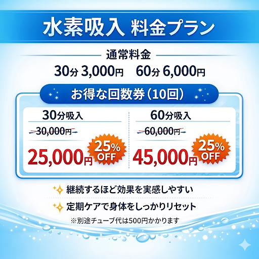 当院で使用する水素酸素発生装置は発生量が大量ですので30分でも体の隅々まで水素が行き届き満タンになりますが特に症状がお辛い場合は60分コースのご用意も御座います。60分コースですと6000円となります。